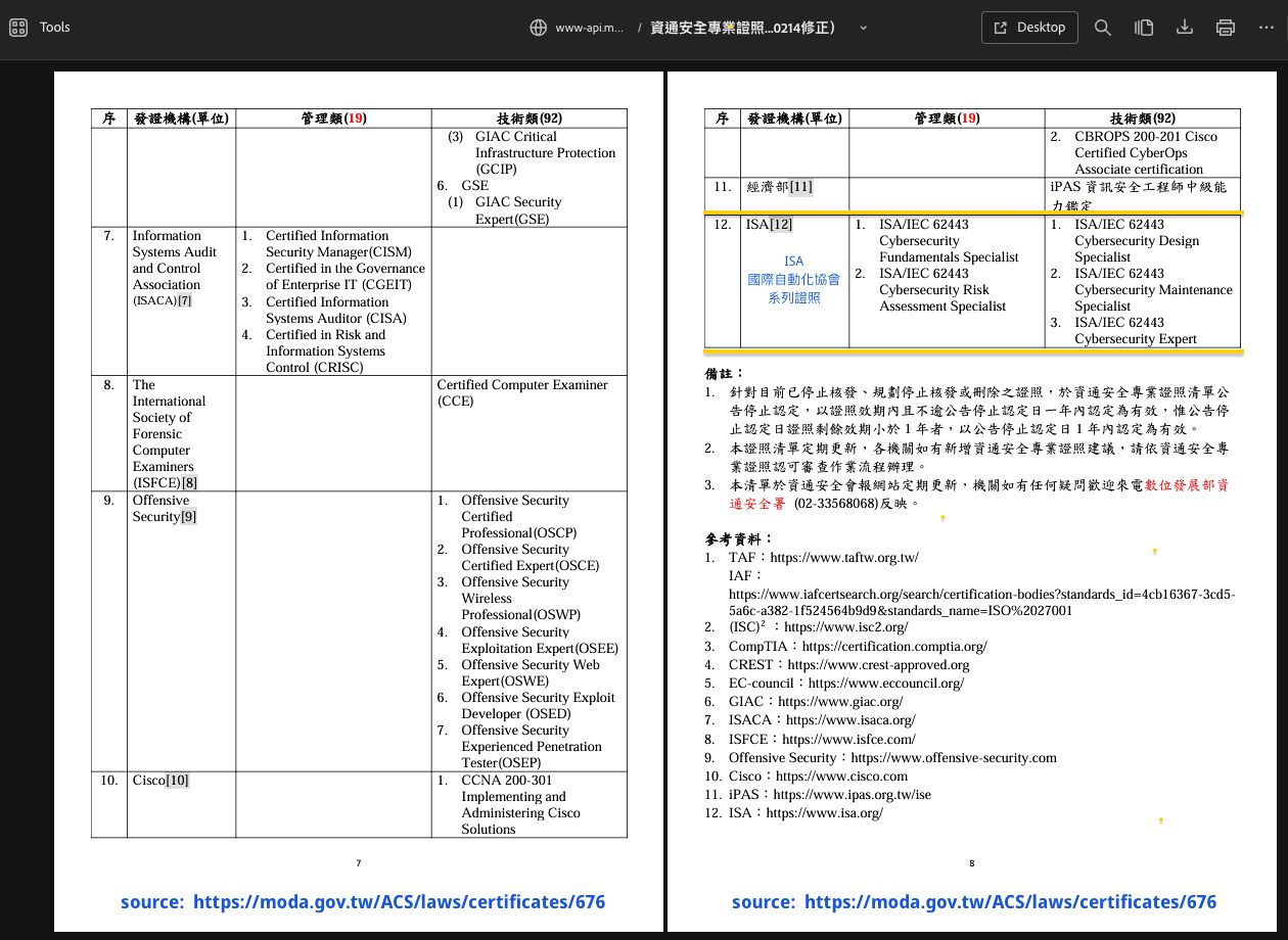 這裡和各位分享由數位發展部資通安全署公告的資通安全證照清單。