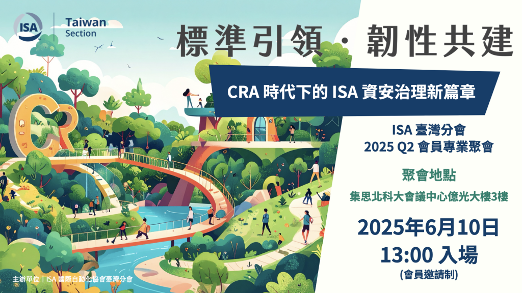 本次專業聚會主題為「標準引領.韌性共建:CRA時代下的ISA資安治理新篇章」,隨著歐盟《Cyber Resilience Act》於2025年正式生效,全球對產品資安要求的規範進入關鍵階段,也同步揭開智慧製造與關鍵基礎設施邁向資安標準和法規治理的新篇章。為了協助臺灣產業快速理解並因應這場結構性變革,ISA臺灣分會誠摯邀請您參加六月份的專業聚會。