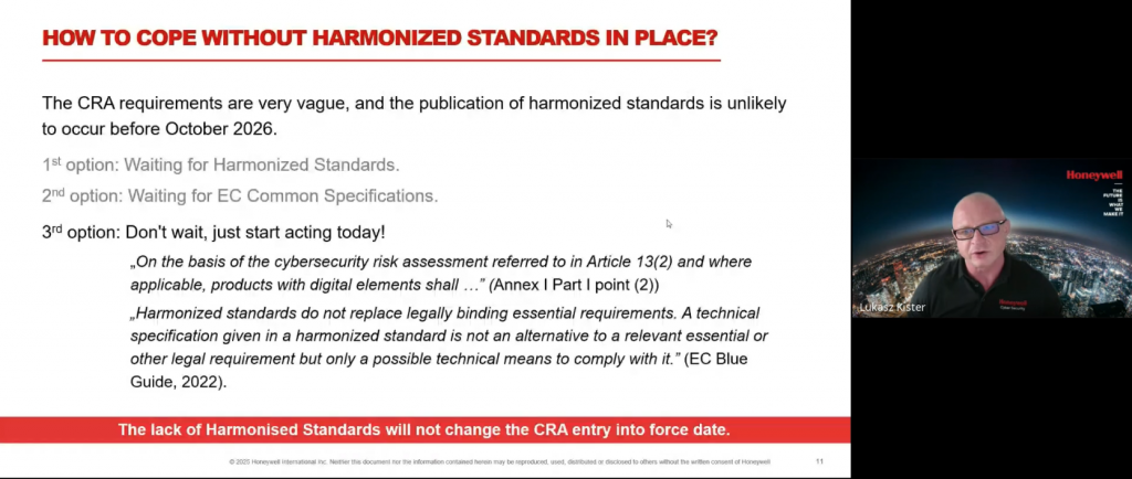 面對協調標準預計在 2026 年底後才發布的現況,Dr. Kister 建議企業不要等待,應立即行動。他指出,協調標準並非強制性,它們只是提供符合法規的技術途徑,而非取代法律要求。因此,企業應基於詳細的網路安全風險評估,來理解並實施必要的安全措施。